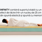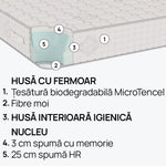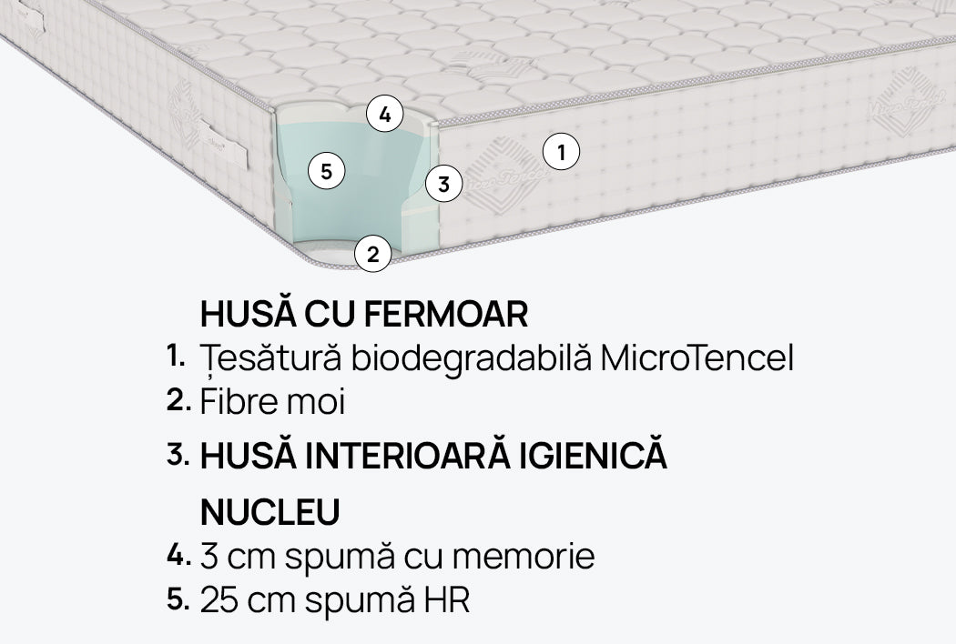 de calitate superioară și are un nucleu din spumă foarte elastică, care menține corpul în poziția corectă în timpul somnului și spumă cu memorie pentru oferirea unei senzații de extra confort.